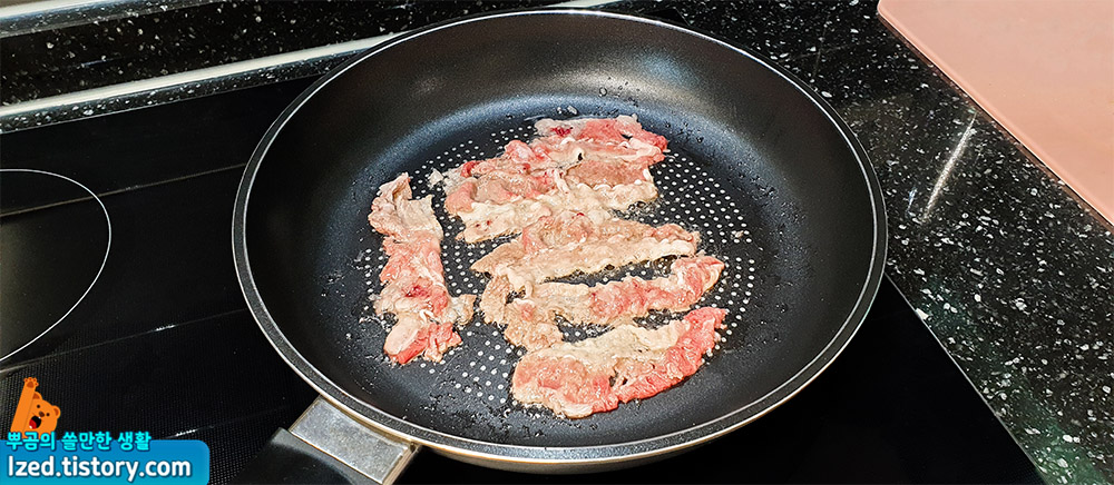 팬에 기름을 두르고 우삼겹을 구워줍니다.