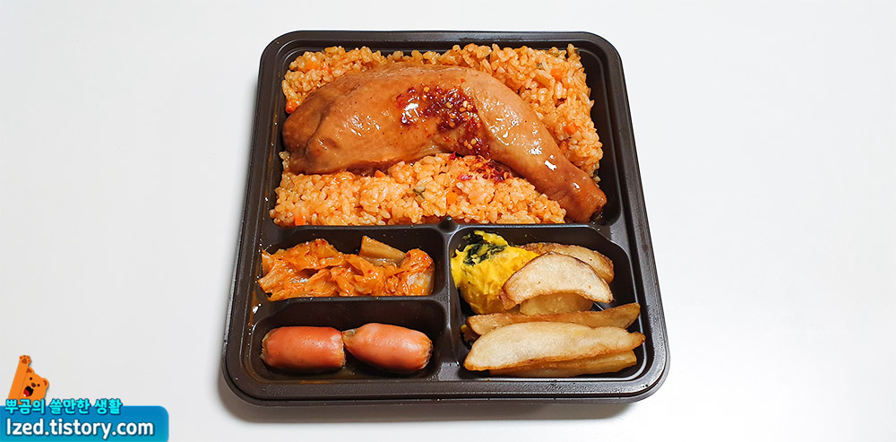 감자튀김, 단호박샐러드, 볶음김치, 소시지 등