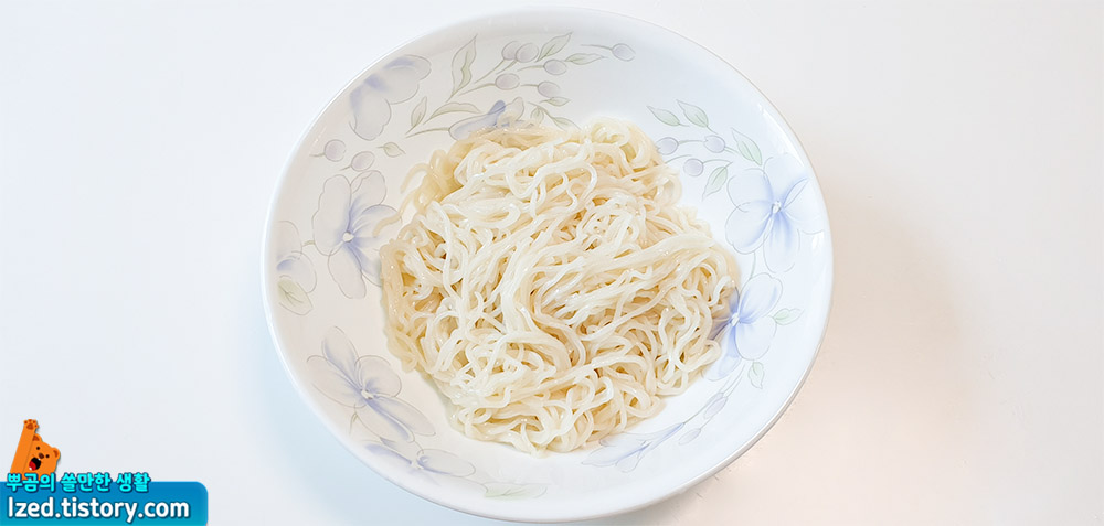 ④ 면을 그릇에 담고 비빔국수 소스를 부어줍니다.