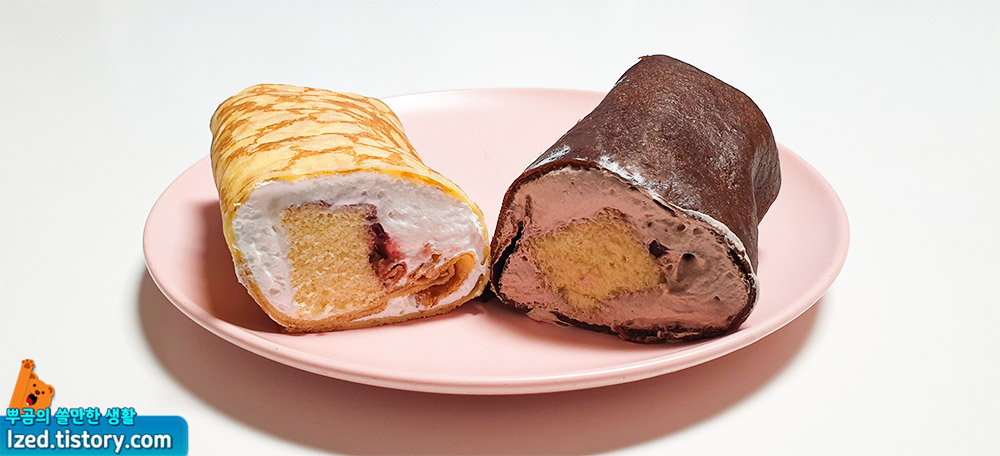 이제 두가지 맛 수건케이크를 하나씩 잘라 살펴보면,