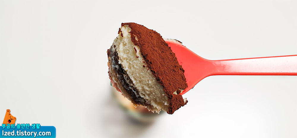 이제, 티라미수 케이크를 스푼으로 떠서 먹어보면..