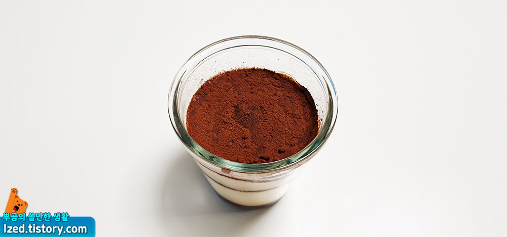 유리컵안에 티라미수 케이크가 들어있는데 커피는 물론,