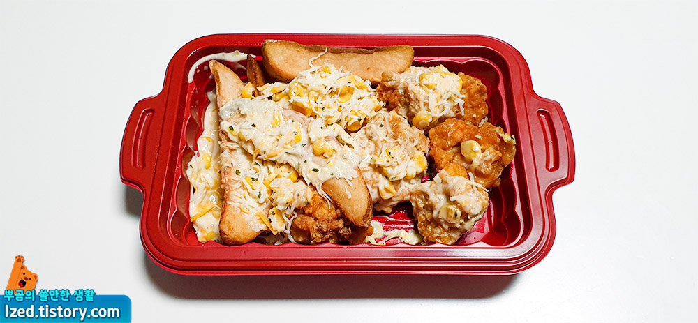 콘치즈와 웨지 감자 튀김, 치킨 가라아게를 넣어서