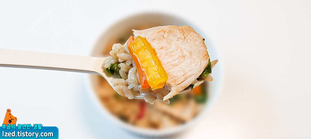 이제 본격적으로 닭가슴살과 함께 잘 비벼진 밥을