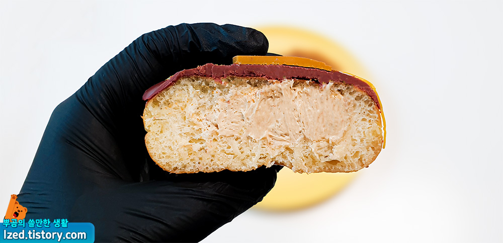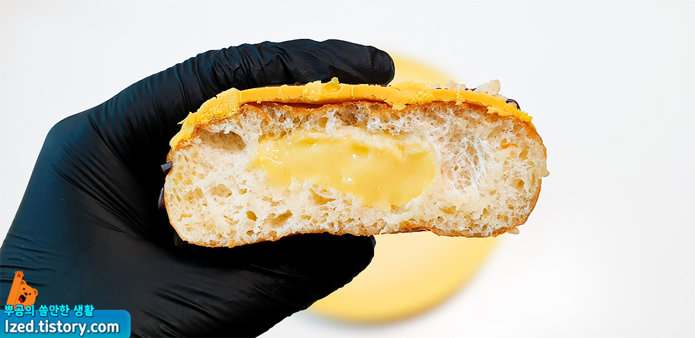 노란빛 도넛 반을 잘라서 한입 먹어보게 되면..