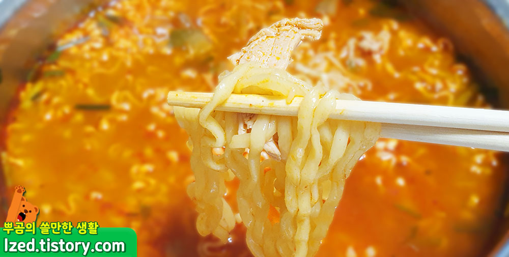 젓가락으로 닭고기와 함께 후루룩 하면! 은은한 닭개장의 풍미가 올라오긴 합니다. 닭고기도 그 향을 품고 있어서 씹을수록 닭개장의 향이 올라오는 느낌입니다. 칼칼한 맛도 꽤나 좋구요. 하지만, 닭개장의 느낌은 한 20% 정도? 나고 나머지 80%는 그냥 라면맛인 듯 합니다. 화려한 패키지에 비해서 그렇게나 맛있는 닭개장의 맛은 느낄 수 없었는데요. 조금 아쉬웠네요.