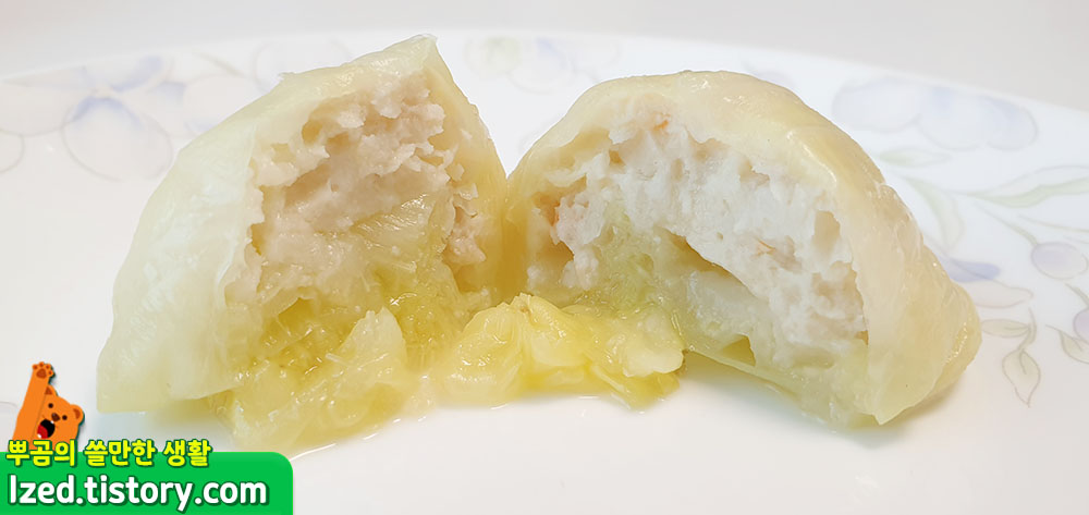 자! 반을 갈라봤는데요. 꽤나 두껍게 쌓여진 양배추안에 닭가슴살이 살포시 들어가 있는게 보이시죠? 솔직히 닭가슴살보다 양배추가 훨 많은 것 처럼 느껴지기도 하는데요. 또한, 양배추와 닭가슴살에서 품고있던 육수와 채수가 흘러나와 진짜 딤섬이나 만두같은 느낌이 나기도 하네요. 그럼 한번 먹어볼까요?