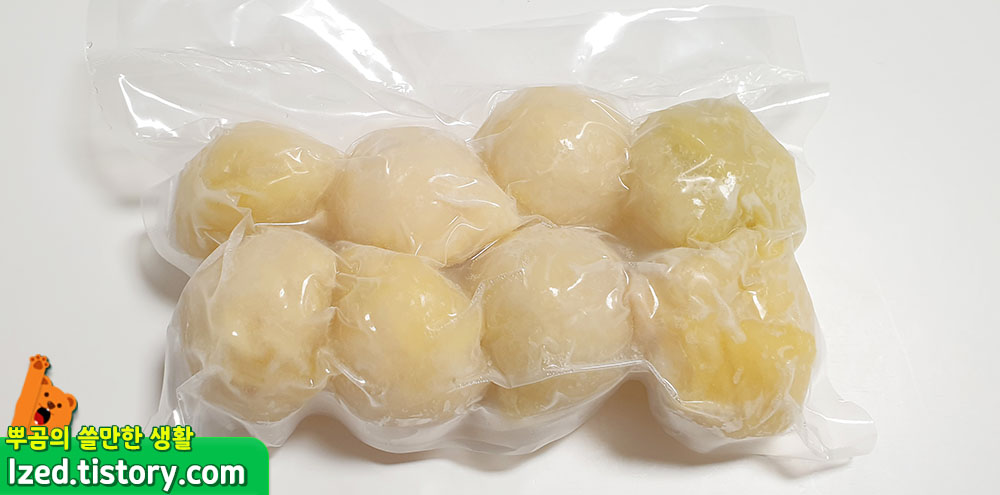 제품을 열어보면, 이렇게 8개씩 진공포장된 팩이 4개가 들어있는데요. 깔끔하게 먹기엔 참 좋을 듯 하네요. 32개를 막 우겨넣지 않고 이렇게 조금씩 소분하여 진공포장한 것은 좋은 아이디어 같습니다. 기본적으로 제품은 냉동보관이고 드시기 전에 잠깐 밖에서 해동시키고 조리하는 것을 추천드립니다.