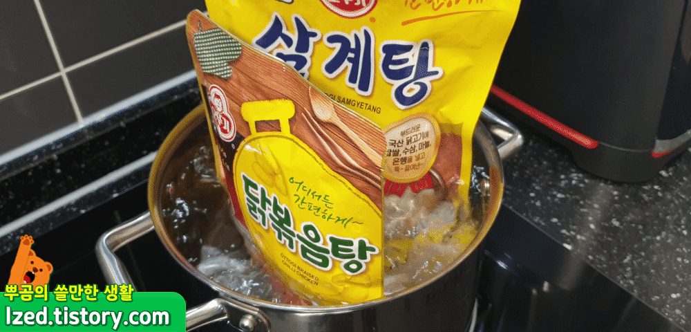 저는 2개 다 먹을 것이기 때문에, 집에 있는 큰 냄비에다가 물을 받고 끓이기 시작했습니다. 물이 끓어오르기 시작하면 준비해놓은 닭볶음탕과 삼계탕을 봉지채 넣으면 되는데요. 무거운 삼계탕은 자리를 딱잡고 우뚝 서있는 가 하면, 상대적으로 가벼운 닭볶음탕은 넣으면 이리저리 움직이고 물을 튀기니 끓는 물에 데이지 않도록 조심해야 겠네요.
