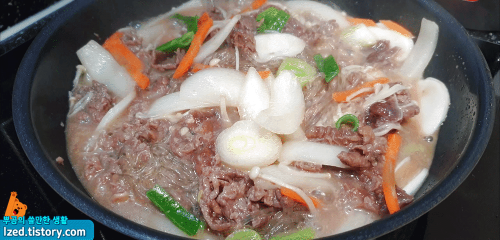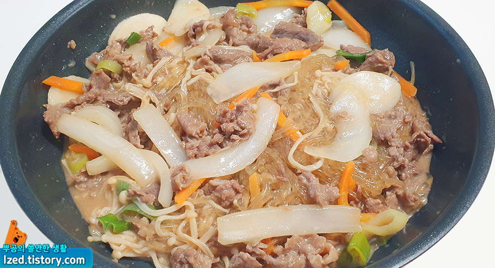 파, 당근, 양파, 버섯등 야채, 떡 등 으로