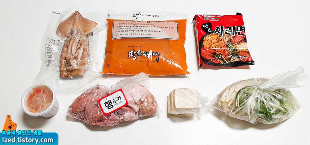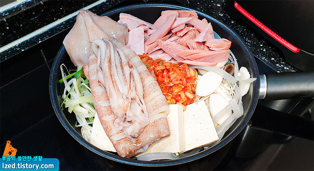 통오징어, 부대찌개 소스, 사리면,